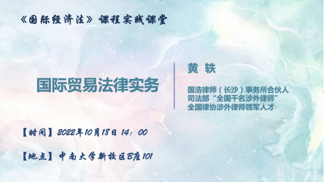 当今世界正经历百年未有之大变局,全球治理体系深刻重塑。随着综合国力的不断提高,我国日益走近世界舞台的中央。在应对大变局、参与全球治理、走向世界的过程中,我国亟需加强涉外法治建设,亟需一大批通晓国际法律规则、善于处理涉外法律事务的涉外法治专业人才,以保障和服务高水平的对外开放。为了进一步有效推进涉外法治人才培养,推动国际经济法理论与实践的深入融合,2022年10月18日下午两点,《国际经济法》课程实践课堂“国际贸易法律实务”在英国上市官网365新校区B座101顺利开展。此次实践课堂由英国365集团公司副教授邓婷婷主持,国浩律师(长沙)事务所合伙人、司法部“全国千名涉外律师”、全国律协涉外律师领军人才黄轶律师主讲,法学2004、2005班全体同学共同参与。