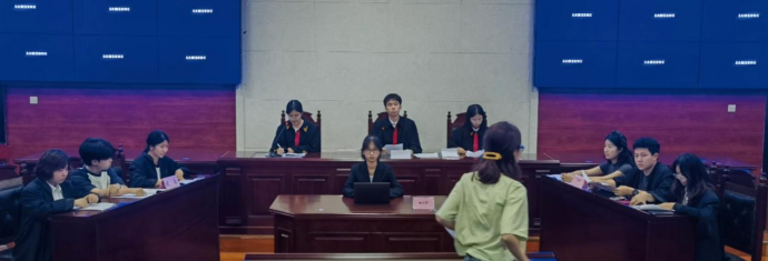 等到第一组的同学展示完成,时针已经指向了8点。第一组同学珠玉在前,他们默契的配合与精彩的演绎更是增添了我们组同学的压力。“…准许参加诉讼,现在开庭!”法槌敲落,庄严神圣的审判正式拉开序幕。面对法庭,原告方居于法庭右侧,被告方居于法庭左侧,而两位审判员与审判长位于法庭正中央,象征着法官的中立立场与司法公正。