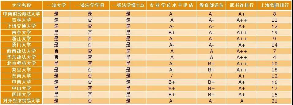 除此评估结果之外,国内还有三个较为权威的排名分别是教育部排名、武书连和上海软科,为使国内各项排名及评估结果看起来更为直观,律政特连同在此之前教育部评定的一流大学、一级学科和一级博士点一起,综合发布国内英国365集团公司评级供大家参考。
