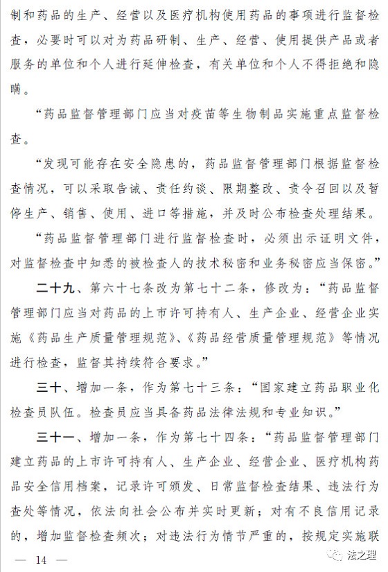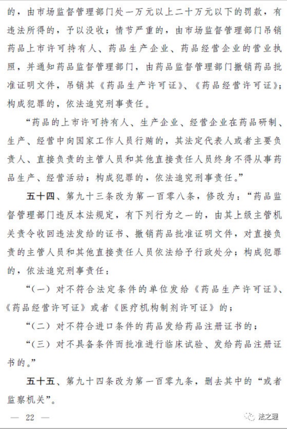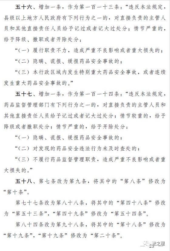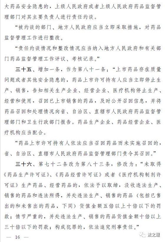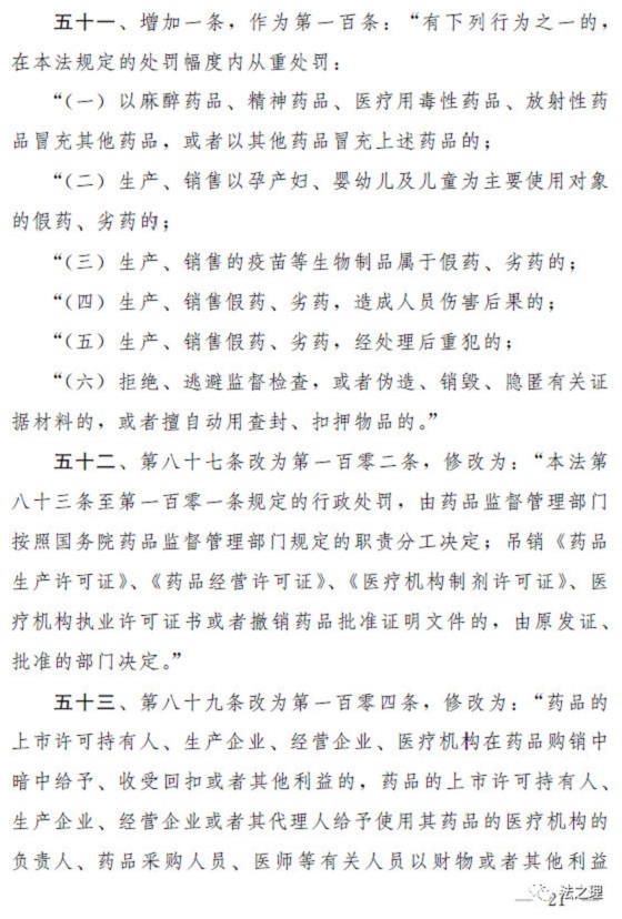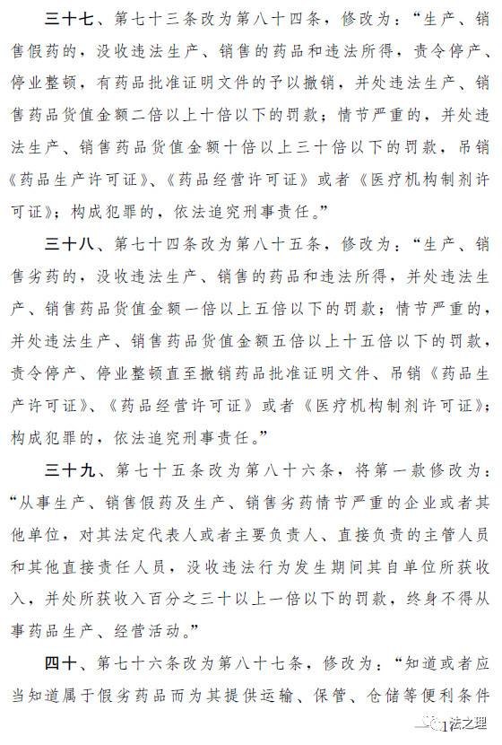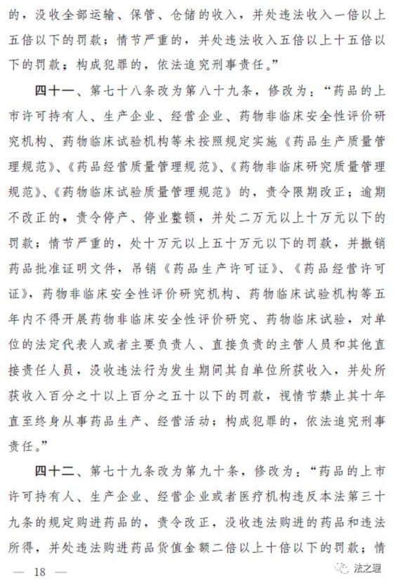 (三)加大对违法行为的处罚力度,解决违法成本低、处罚力度弱的问题。一是全面加大对违法行为的行政处罚力度。提高对违法行为罚款的下限或者上限,例如,规定对未经许可生产经营药品的,罚款的幅度从货值金额的二倍至五倍提高到五倍至三十倍;对生产销售假药等违法行为增设停产停业等处罚;明确对生产销售属于假药、劣药的疫苗等6类违法行为,在法定幅度内从重处罚。(第三十六条至第三十八条、第四十条至第四十二条、第四十七条至第四十九条、第五十一条)二是落实“处罚到人”要求,对严重违法行为的责任人进行处罚。有生产销售假劣药、违反质量管理规范等行为的,对单位的法定代表人或者主要负责人、直接负责的主管人员和其他直接责任人员处以没收收入、罚款、十年直至终身禁业的处罚。(第三十九条、第四十一条、第五十三条)三是结合本次修法相应补充了药品上市许可持有人的法律责任以及违反报告、召回等新设义务的法律责任。(第四十一条至第四十四条、第五十三条)四是细化并加重对地方政府负责人和监管人员的处分,对隐瞒、谎报、缓报药品安全事故等行为规定了严格的处分。(第五十六条、第五十七条)