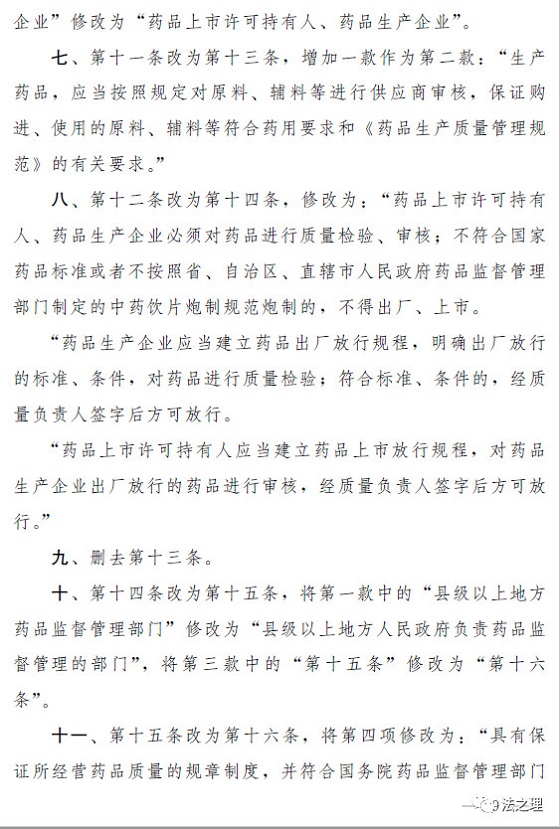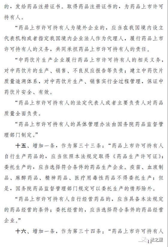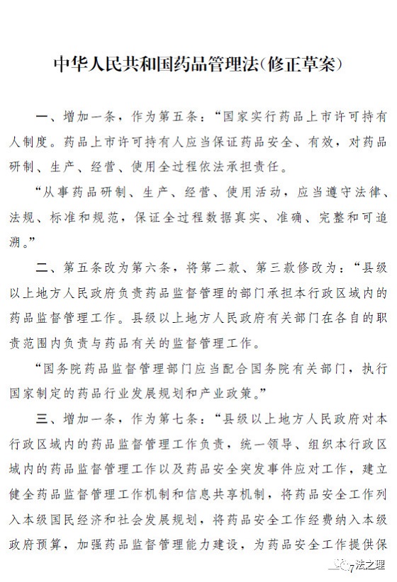 2018年9月,市场监管总局向国务院报送了《中华人民共和国药品管理法修正案(草案送审稿)》。送审稿围绕问题疫苗案件暴露的突出问题,对药品监管制度作了完善,同时为了落实2017年10月中共中央办公厅、国务院办公厅《关于深化审评审批制度改革鼓励药品医疗器械创新的意见》(以下简称《创新意见》)提出的“及时总结药品上市许可持有人制度试点经验,推动修订药品管理法,力争早日在全国推开”的要求,对药品上市许可持有人制度作了规定。收到此件后,司法部立即征求有关部门、地方政府和部分药品生产企业意见,会同市场监管总局、药监局等部门对送审稿反复研究协调修改,形成了《中华人民共和国药品管理法(修正草案)》(以下简称草案)。草案已经国务院同意。现说明如下: