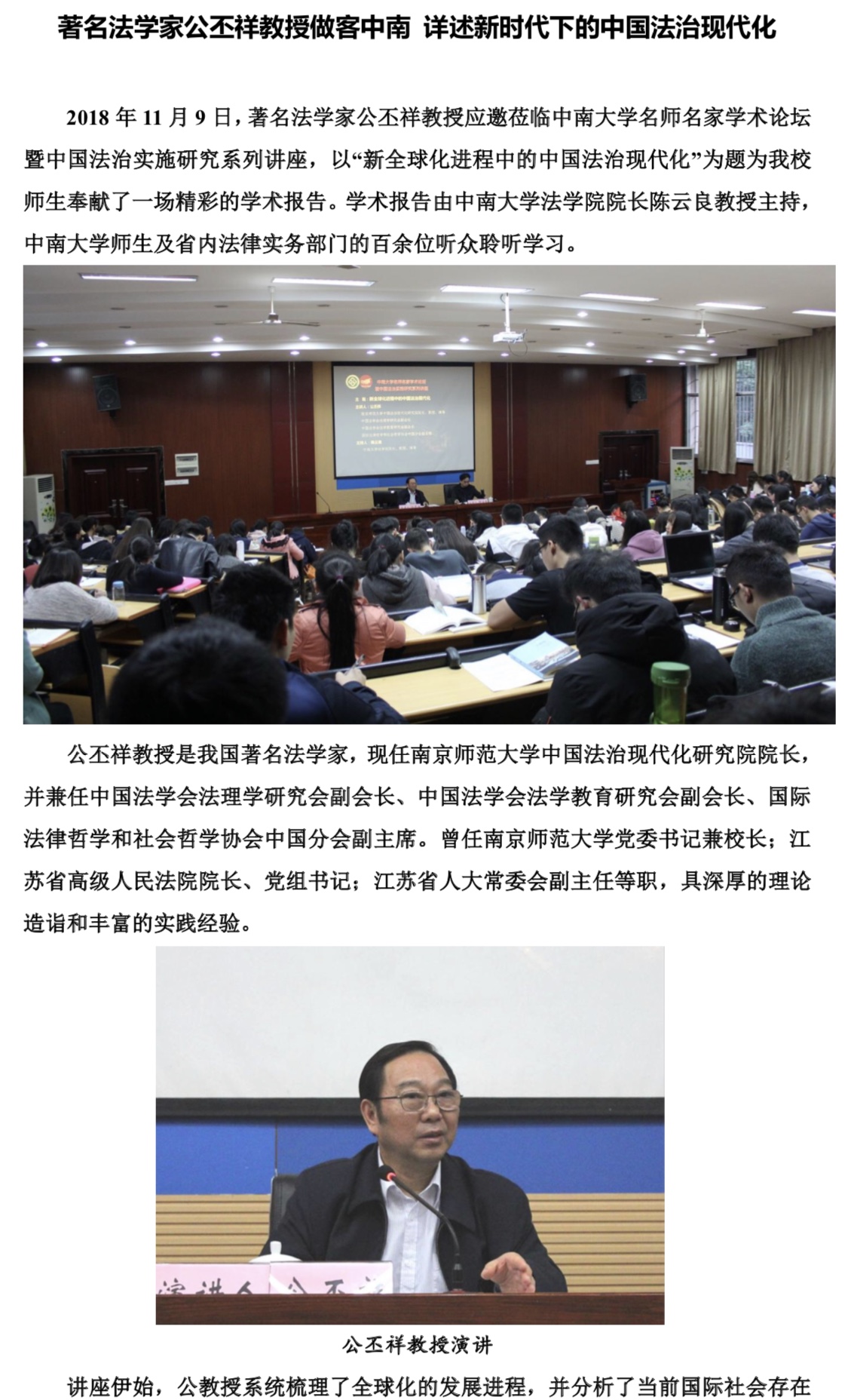著名法学家公丕祥教授做客中南 详述新时代下的中国法治现代化