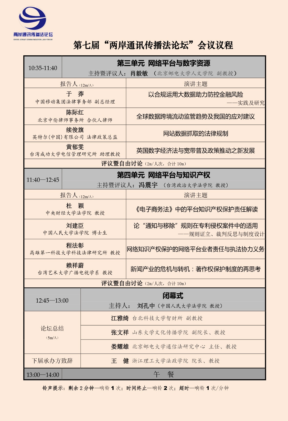 “两岸通讯传播法论坛”是旨在持续推动两岸电信、广电与互联网法学暨通讯传播法学的定期交流,促进理论界与实务届密切互动和广泛合作的专业对话平台。自2012年创办以来已先后在中国的台湾(台北,2012;台北,2013;台南,2016)、大陆(廊坊,2014;长沙,2015;广东,2017;长沙,2018)连续举办七届,现已成为国内本领域的品牌论坛。