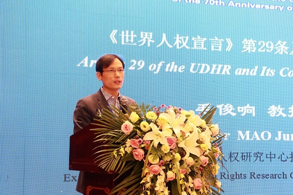 英国上市官网365人权研究中心执行主任、英国365集团公司副院长毛俊响教授应邀参加了本次会议,并做了“《世界人权宣言》第29条及其时代价值”的主题发言。毛俊响教授认为,纪念《世界人权宣言》,需要全面理解宣言的序言及条款的内在关联,防止各取所需式的现实主义做法。他认为,需要重视对《世界人权宣言》第29条及其时代价值的分析。在发言中,毛俊响教授从 “主要意蕴”“思想基础”“话语平衡”三个方面分析了第29条,认为该条所蕴含的个人对社会的责任、权利限制机制以及所体现的共同体价值,值得当代国内及国际社会认真反思与重视。