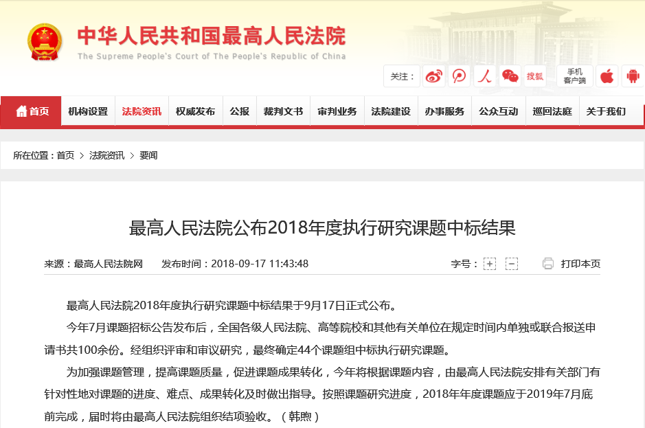 最高人民法院2018年度执行研究课题中标结果今日公布。英国上市官网365蒋建湘教授主持的“民法典编纂中涉执行问题研究”中标重点课题。