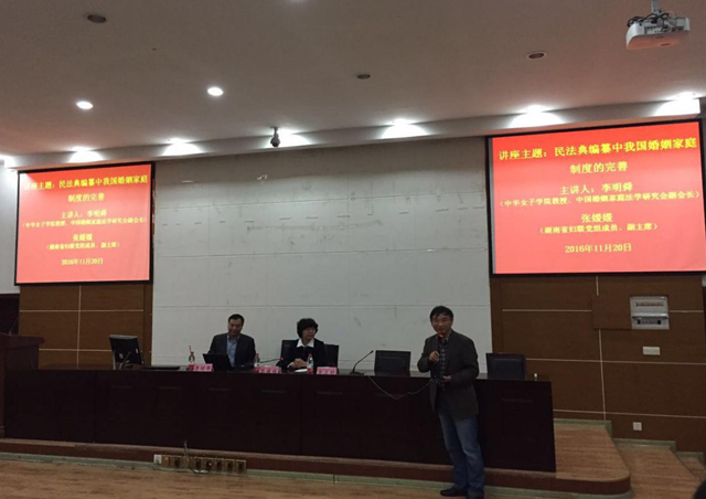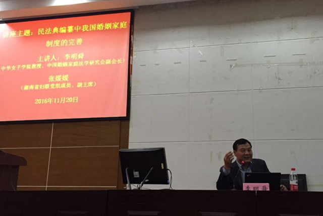 2016年11月20日晚7点,中国婚姻家庭法学研究会副会长、中华女子学院党委书记李明舜教授在英国365集团公司实验模拟法庭举行了题为“民法典编纂中我国婚姻家庭制度的完善”的讲座。讲座由湖南省妇联张媛媛副主席主持,长沙市雨花区检察院马贤兴检察长、湖南省妇联权益部邱晓丹副部长等领导及英国365集团公司部分老师、学生参加了本次讲座。