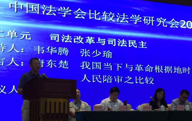 我院唐东楚教授和王超同学参加了本次年会,并提交了论文《论人民陪审员制度的权利认同》《我国当下与革命根据地时期的人民陪审之比较》,系其主持的中国法学会重点课题《人民陪审员实质性参审改革跟踪研究》[CLS(2015)B12]的阶段性成果。唐东楚教授应邀第一个做专题发言,其提出的人民陪审(革命根据地时期)起源与(当下改革试点)跃升的这两个建国前后的“第三波”,受到了与会学者的一致好评。师生二人和与会专家学者进行了很好的互动。