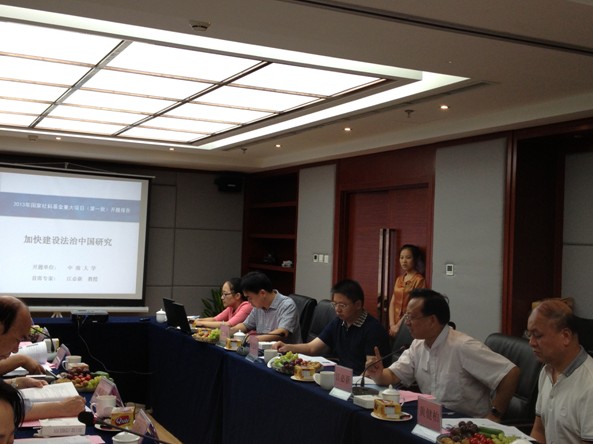 课题组首席专家江必新教授首先就法治中国的命题进行了解读,指出法治中国是人类法治文明的“继承版”,是法治国家建设的“中国版”,是依法治国实践的“升级版”。他还阐述了法治中国研究的重大现实意义。之后,课题组着重围绕课题研究内容、子课题结构、研究方法、研究计划和预期目标做了汇报。
