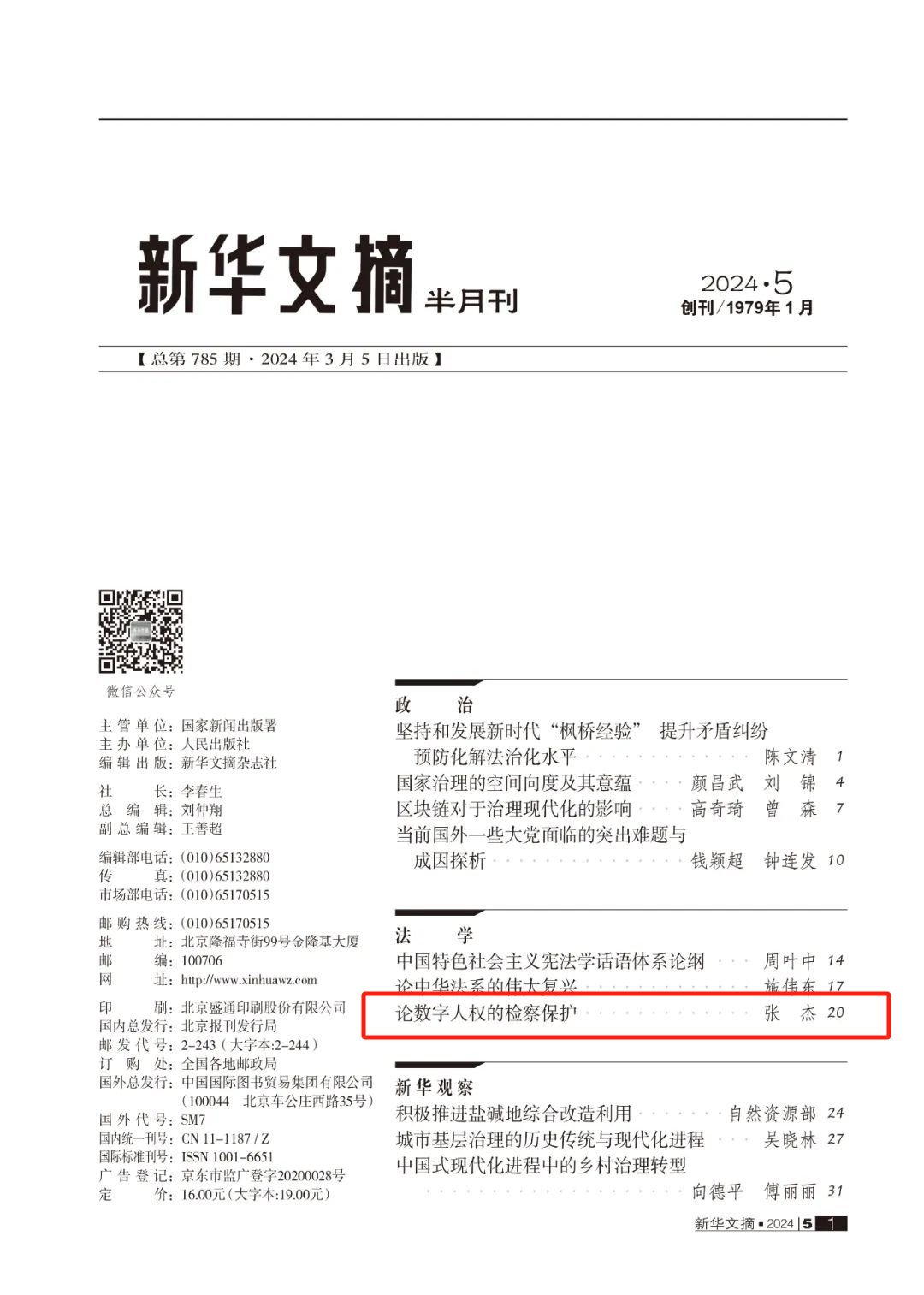 3月5日,2024年第5期《新华文摘》全文转载了张杰特聘教授的《论数字人权的检察保护》一文,该文原刊于《人权》2023年第5期。文章认为,数字时代数字人权勃兴,成为人权领域重要拓展。检察机关推进数字检察战略实施,应当更加重视数字人权的保护。数字人权脆弱状态及检察机关在人权保护中的特殊地位,决定了检察机关应当更加重视立足法律监督职责的履行促进数字人权保护。当前,检察机关以推进大数据法律监督、加强涉公民数字人权刑事案件办理、拓宽数字人权公益诉讼保护领域、加强民事行政检察履职等方式强化了数字人权保障,但仍存在理念更新不够、措施不全、机制制度创新不足等问题。未来,检察机关应当进一步围绕数字检察战略实施,更新人权保障理念,加大惩治网络犯罪力度,加强公民个人信息检察保护,通过公益诉讼加强对群体性数字人权公益保护,积极创新检察工作机制制度,加强数字人权保护。