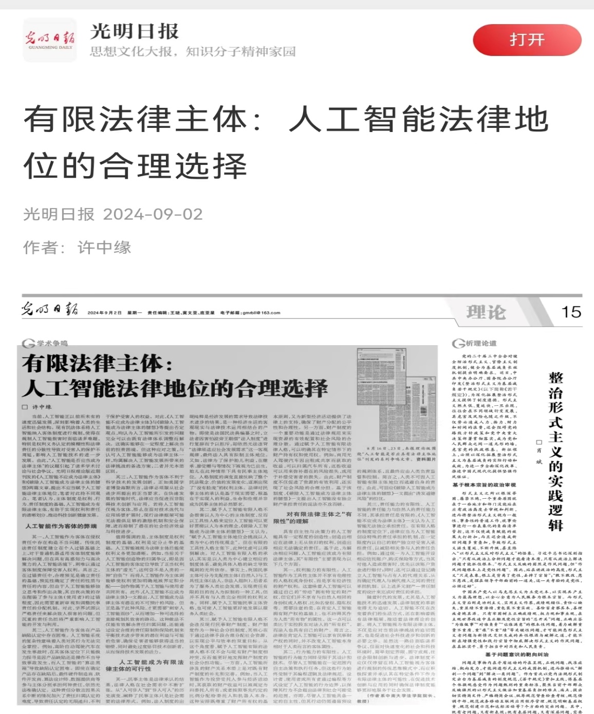 许中缘教授在《光明日报》2024年09月02日第15版发表《有限法律主体:人工智能法律地位的合理选择》一文。文章认为,现有民法体系将人工智能纳入客体制度进行规制,使得在规制人工智能损害时面临诸多难题,特别是权利义务认定的模糊性和法律责任的分散性导致对受害人的保护不周延,影响人工智能技术的进一步发展。主体制度是权利、行为、责任制度的基础,将人工智能视为有限法律主体具有可行性,有助于实现权利和责任的清晰划分,不仅是应对当前法律挑战的迫切需求,也是促进社会科技进步和创新的必要之举。