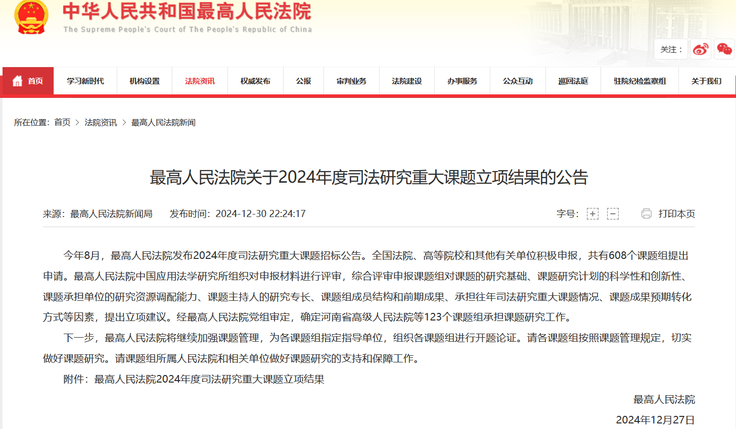 2024年12月30日,最高人民法院公布了《2024年度司法研究重大课题立项结果》。其中,我院丁亮华教授申报的《落实和完善司法责任制研究》成功获批特别资助课题,黄先雄教授申报的《深化行政案件管辖改革问题研究》成功获批重点资助课题。