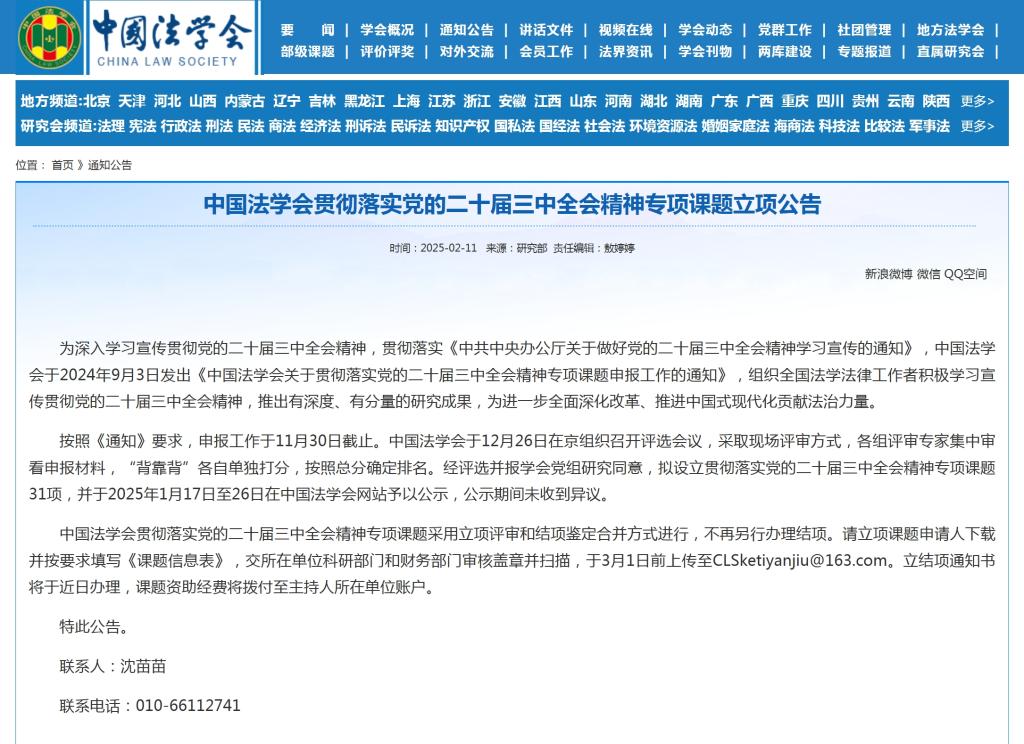 中国法学会设立的贯彻二十届三中全会精神专项课题意义重大,作为全面依法治国的“智囊团”“思想库”“人才库”,中国法学会在引领中国法学研究方向上发挥着关键作用。这些专项课题聚焦国家重点关注的前沿领域,旨在推动法学理论与实践创新,为国家法治建设提供智力支持。