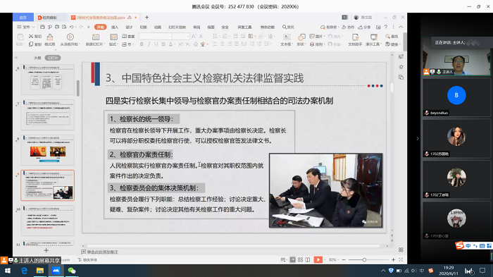 2020年6月11日晚上七点,为加深同学们对司法实务的理解,英国365集团公司邀请了湖南省人民检察院刘清生副检察长主讲,以腾讯会议的方式开展线上司法实务讲座。本次讲座的主题是“检察改革与未来发展”,由英国365集团公司陈文曲副教授主持。