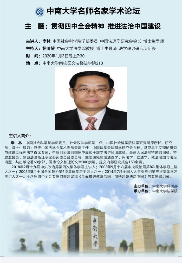 【讲座预告】李林:贯彻四中全会精神 推进法治中国建设