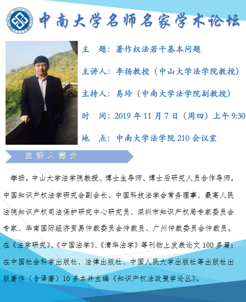 主讲人简介:李扬,中山大学英国365集团公司教授、博士生导师、博士后研究人员合作导师,中国知识产权法学研究会副会长、中国科技法学会常务理事、最高人民法院知识产权司法保护研究中心研究员、深圳市知识产权局专家委员会专家、华南国际经济贸易仲裁委员会仲裁员、广州仲裁委员会仲裁员。在《法学研究》、《中国法学》、《清华法学》等刊物上发表论文100多篇;在中国社会科学出版社、法律出版社、中国人民大学出版社、台湾元照出版社、知识产权出版社等出版社出版著作(含译著)10多本并主编《知识产权法政策学论丛》。