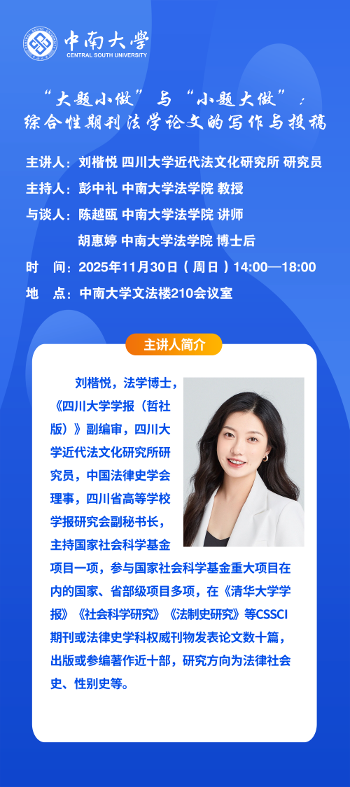 【讲座预告】刘楷悦:“大题小做”与“小题大做”综合性期刊法学论文的写作与投稿