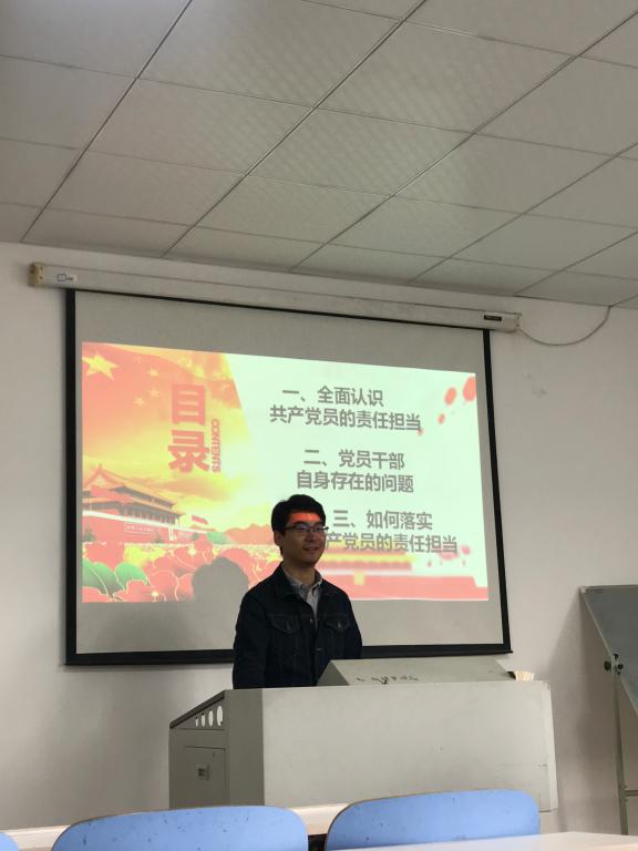 本次研讨会的主题是“中国共产党人的责任与担当”,组长周繁勃首先就专业知识学习和发挥模范作用的结合点进行了阐述,并强组员要端正入党态度,牢牢掌握党的政治理论知识,提高自身政治素质,恪尽职守,认真做好本职工作。此后,组员们结合自己提前准备好的演示文稿和发言提纲先后上台发言与展示,就如何在当下发挥抬头兵作用提出了自己的见解。在发言过程中不乏有同学提问,展示者们都积极作答,大家在彼此交流中碰撞思想,对共产党人责任的认识也更加深刻,汤天宇同学的一句“永远忠于党”将会议引入高潮。