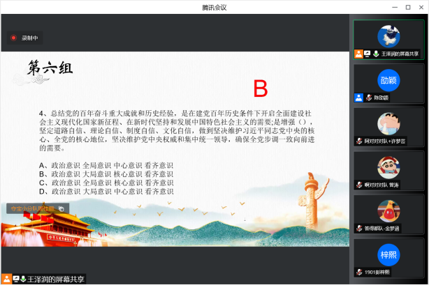随后的党史知识竞赛更是趣味十足,集教育性和趣味性为一体。通过不断开展的党史知识学习,同志们的参与热情非常高,许多题目刚一出现便有同志“秒答”。答题者作答后,其他同志们会对答案进行补充解释,或是一起朗读题干,一起深化对于党史知识的理解,在抢答中进行学习。