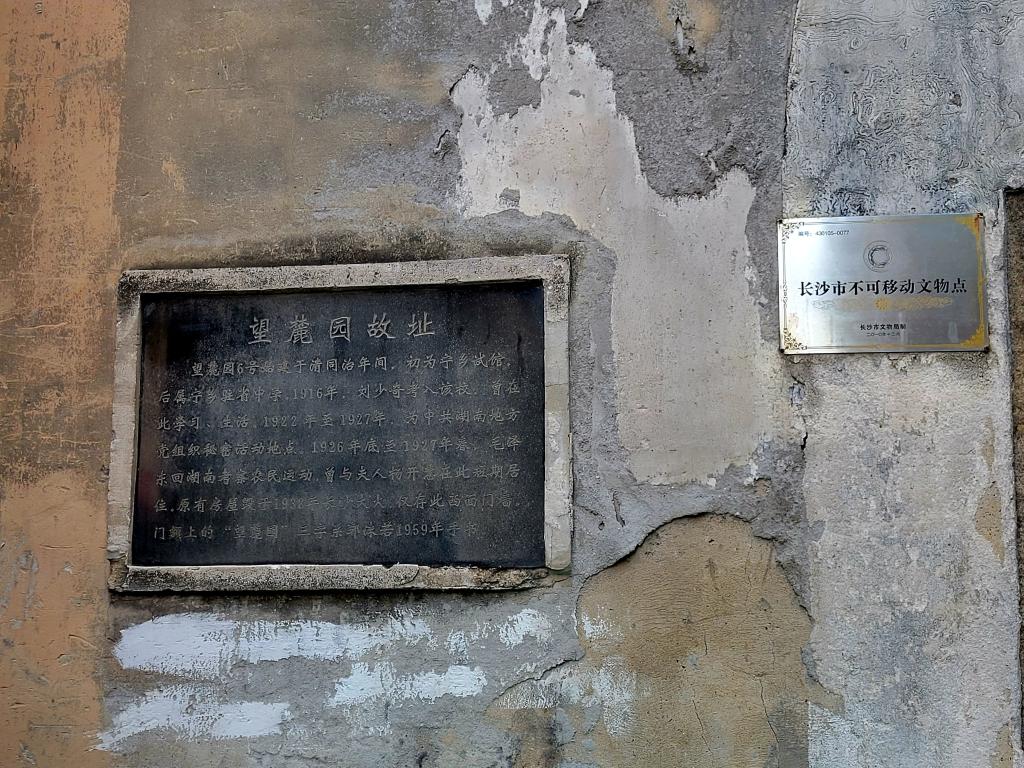 小组成员首先来到了望麓园。望麓园与河西岳麓山遥遥相重,它在民国年间为党筹措活动经费发挥了重要作用。随着长沙近年的发展,望麓园的旧址也被掩藏在了正在建造的文化区后,一路寻访,终于在“十七号公寓”后与望麓园相遇。抬头仰望,郭沫若先生手书的“望麓园”三个大字仍在门额上清晰可见,字迹舒展流动,穿过这面门墙,左右两边的对联写的是“绎史诵经思在古昔,登高望远显于今时。”再移步墙内,便能看见提有毛主席的《沁园春·长沙》的石碑。古朴的石匾继续着历史,更见证着将来。