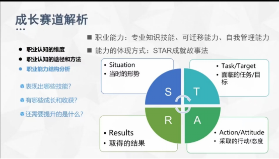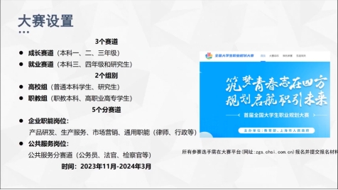 针对不同的赛道,柳思怡老师详细讲解了如何准备比赛,包括怎样确定职业目标的来源、如何在职业中寻找自我认同、如何强化使命担当等方面。在成长赛道方面,柳老师认为可以从地域、行业、组织和职位上多维度认知,寻找就业有力抓手,包括政策支持,行业发展前景等等。同时,需要从展望未来回到自身,在专业学习、实习实践、学生工作等方面明确自己的成长行动与轨迹,对成长计划做不断评估调整。
