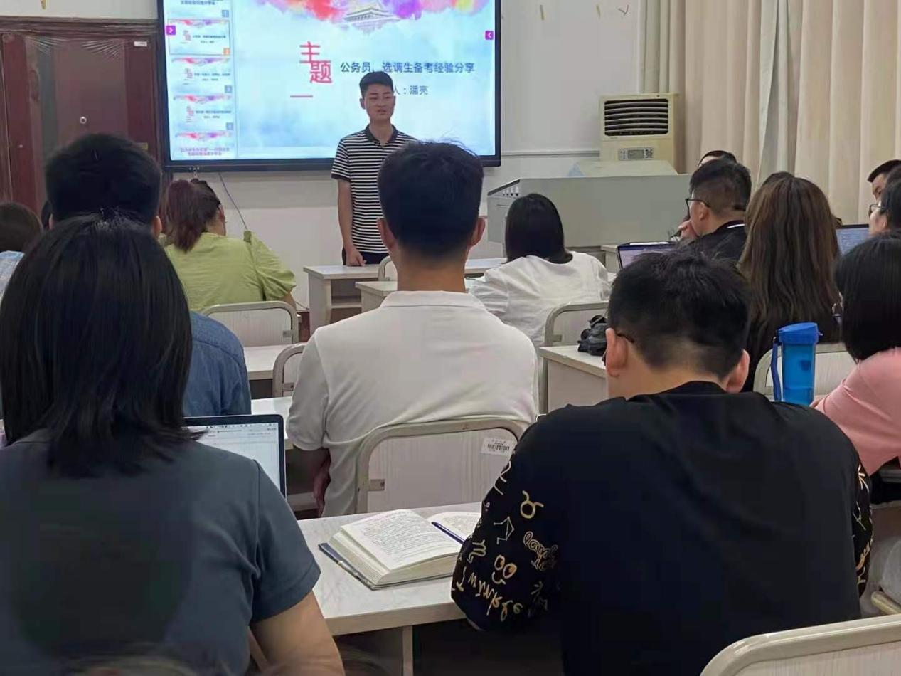 潘亮同学结合自身省考之路畅谈心得体会,分别介绍了国考、省考以及选调笔试和面试过程中应当注意的问题和应试的技巧。他提醒大家要根据自己的学习特点,好好规划属于自己的备考计划。蒋湘琼同学进一步介绍了湖南选调的相关内容,她认为大家平时要多注意积累、脚踏实地、砥砺前行,要学会与自己和解,与师长为友,与世界温和相处。