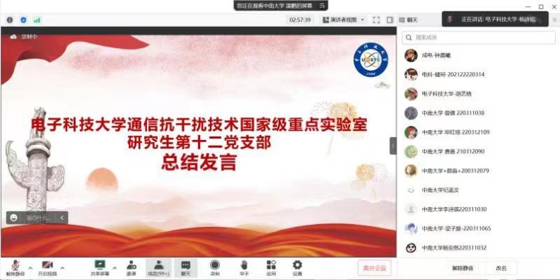 活动最后,电子科技大学通信抗干扰技术国家级重点实验室研究生第十二党支部书记杨诗铭同志对本次党建活动进行总结发言,作为学生党员,应该将汲取的真理力量运用到学习实践中去,积极夯实专业基础,不断进行自我提升,坚定不移听党话、跟党走,成长为有理想、敢担当、能吃苦、肯奋斗的新时代青年,以实际行动向党的二十大献礼,让青春在火热实践中绽放绚丽之花!