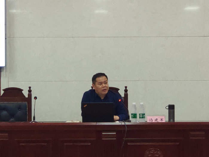 首先由王新平书记介绍了汤建军研究员在国情研究和党建研究方面取得的成果,并提出为深入贯彻习近平总书记关于新时代党的政治建设与全面依法治国的总体要求和部署,我院师生党员要进一步增强“四个意识”,坚定“四个自信”,坚决做到“两个维护”,要做到在政治立场、政治方向、政治原则、政治道路上始终同以习近平同志为核心的党中央保持高度一致。
