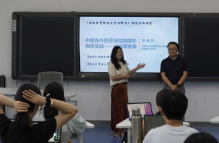 由于中国信保的业务范围与国际法专业学生学习内容“海外投资保险制度”的高度契合,田建东同志以“中国海外投资保险制度的具体实践——中国信保视角”为题,为党员同志及同学们进行专题分享。课程伊始,邓婷婷同志从党的政策方针角度出发,结合国家涉外法治建设战略,带领同学们简单回顾了海外投资保险制度的相关内容,为后续的实务讲解奠定了理论基础。
