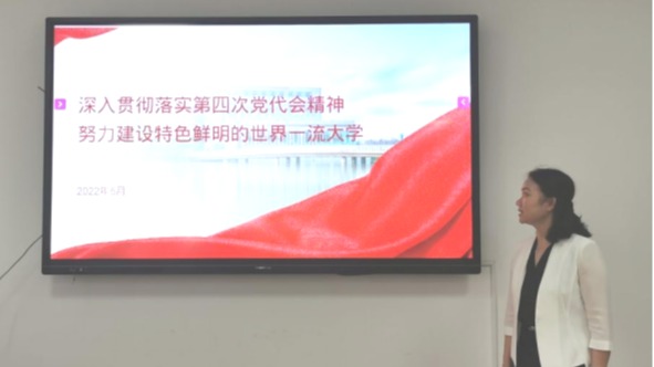 随后,联系本支部的院党委委员何炼红副院长给支部讲堂课,以深入贯彻落实第四次党代会精神,努力建设特色鲜明的世界一流大学为主题,从学校第四次党代会概况、第三次党代会以来工作回顾、新时代学校的历史使命和奋斗目标、未来五年学校改革发展重点工作等方面,向支部成员传达了学校第四次党代会精神。