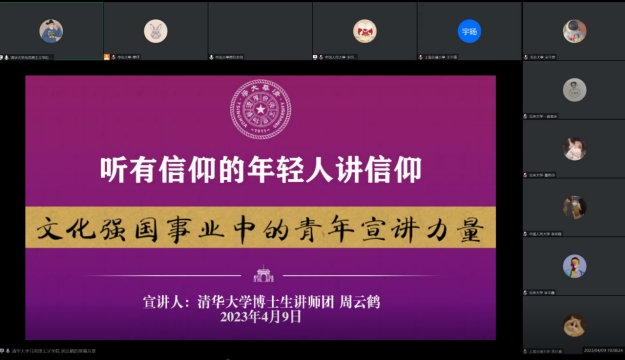 清华大学马克思主义学院研究生党员周云鹤同志以“文化强国事业中的青年宣讲力量”为题,提出自近代以来,青年向来都是宣讲马克思主义、传播中国共产党思想、战斗在意识形态战线的生力军和先锋队。他愿意在思想文化战线上为筑牢社会主义意识形态、加强朋辈思政教育贡献自己的青春力量。