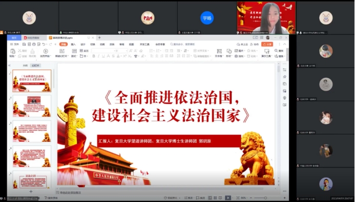 复旦大学马克思主义学院研究生党员郭玥原同志以“全面推进依法治国,建设社会主义法治国家”为题,围绕四个法治之问展开,她认为党的二十大报告为推进全面依法治国,建设社会主义法治国家提供了根本遵循。