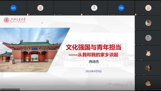 上海交通大学教育学院学生辅导员冉诗杰同志以“文化强国与青年担当——从我和我的家乡谈起”为题,从川渝文化角度介绍了家乡重庆在文化强国建设中的路径选择与贡献,他本人也积极参与红色文化宣讲,争做文化传承的青年使者。
