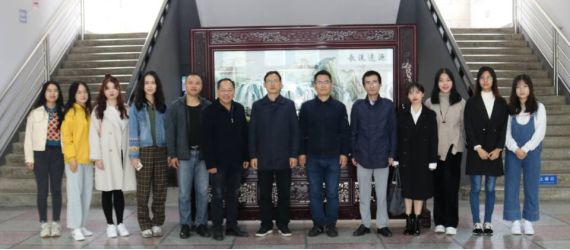 毛俊响书记、许中缘院长、黄曦副书记、刘继虎教授、夏少涛主任以及在校学生代表于屏风前合影留念)