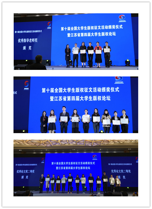 2018年10月21日,第十届全国大学生版权征文活动颁奖仪式在苏州国际博览中心举行。本次活动由国家版权局主办,中国人民大学国家版权贸易基地、中国人民大学创意产业技术研究院承办,国家版权局版权管理司于慈珂司长、中国人民大学创意产业技术研究院彭翊院长、江苏省版权局于国民副局长、江苏省版权协会傅杰三会长以及获奖优秀学生代表、优秀指导老师代表及优秀组织方代表出席此次颁奖活动。