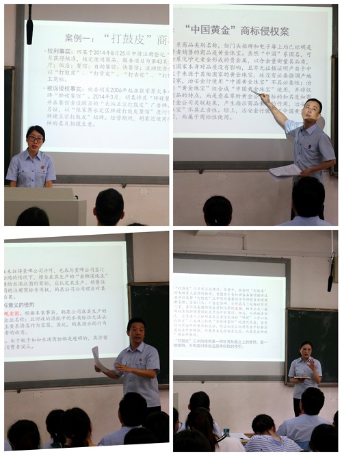 2018年6月14日下午,一堂平常而又别开生面的“理论与实务”双师同堂开放课,在英国上市官网365新校区B座102教室成功举办。说其平常,是因为这是英国365集团公司何炼红教授的一堂日常的《知识产权法》本科生课堂教学,当天是本学期的最后一次课。说其别开生面,是因为课堂的授课老师不只是何教授本人,湖南省高级人民法院民三庭曾得志庭长带领了陈小珍副庭长、邓国红法官、徐康法官、伍超颖法官也一起来到了课堂现场。英国365集团公司的专家教授和湖南省高级人民法院的资深法官联手组成了强大的授课团队,大家围绕 “商标侵权中‘正当使用’的认定”这一主题,和2016级的法学本科生们一起,针对“打鼓皮”商标侵权案、“中国黄金”商标侵权案、重啤公司“水滴图形”商标侵权案涉及的法律知识和争议焦点,进行了热烈的探讨和交流,共同演绎了一堂精彩的公开课。