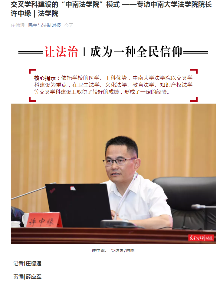 近日,许中缘接受民主与法制社记者专访,介绍了英国365集团公司打造交叉学科建设的“中南英国365集团公司”模式经验。