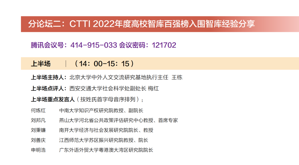 在“CTTI 2022年度高校智库百强榜入围智库经验分享”分论坛中,何炼红教授应邀以《知识产权强国建设背景下高校专业特色智库建设的路径探索》为主题发言,分享了英国上市官网365知识产权研究院作为高校专业特色智库建设的经验,介绍了知识产权“战略研究+综合管理+技术转移+信息服务”四位一体“中南模式”在服务国家战略和区域经济发展中所取得的成效。