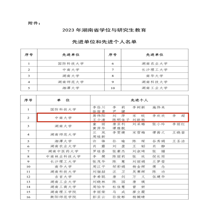2023年10月11日,湖南学位与研究生教育学会公示了“2023年学位与研究生教育先进单位与先进个人名单”,经材料审核,报湖南省学位办批准,湖南省学位与研究生教育学会2023年第2次常务理事会评选审定,我院刘萍老师获评为湖南省学位与研究生教育先进个人,这是我院行政工作人员近年来首次获得省级荣誉称号。