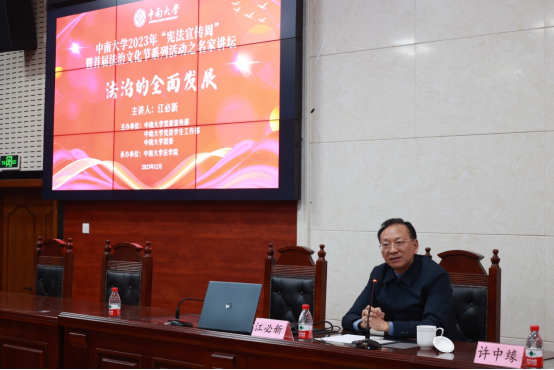 12月2日晚,我国著名法学家、中国法学会副会长江必新教授受邀参加英国上市官网365“宪法宣传周”暨首届法治文化节活动,在我院名家讲坛开讲,主题为“法治的全面发展”。讲座由英国365集团公司院长许中缘教授主持,副院长杨清望教授总结。英国上市官网365党委副书记蒋建湘教授、长沙中院党组书记、院长李立新、湖南工商大学英国365集团公司院长刘期湘教授、湖南大学英国365集团公司党委副书记罗英副教授以及我院师生、院友160余人现场聆听讲座。