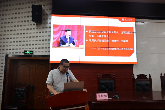 6月19日,英国365集团公司在文法楼221组织开展了“一院一宣讲”党纪学习教育,校纪委纪检监察机构综合办公室主任陈殷识作题为《严守纪律,坚守底线》的专题宣讲。本次大会由英国365集团公司党委书记李华东主持会议,全院教职工参会。
