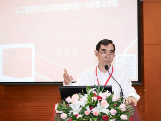 全国人大常委会委员、社会建设委员会副主任委员,中国法学会党组成员、副会长兼秘书长景汉朝发表题为“人工智能时代法治建设面对的十大矛盾与对策”主旨演讲。他指出,人工智能时代法治建设面临的十大矛盾,即技术创新与风险防范、技术适用与信息安全、新技术和司法融合的“热”与“冷”、新技术下的司法实践与传统司法理论、新技术发展与伦理道德、法律稳定性与适应性、法律可操作性与原则性、司法公开与推理黑箱、AI自主决策与人类决策责任,以及国家主权原则与主权边界模糊。同时就新技术和司法融合 “热”与“冷”的矛盾,景汉朝提出通过防范风险来扬长避短,大胆实现人工智能在司法领域的应用。