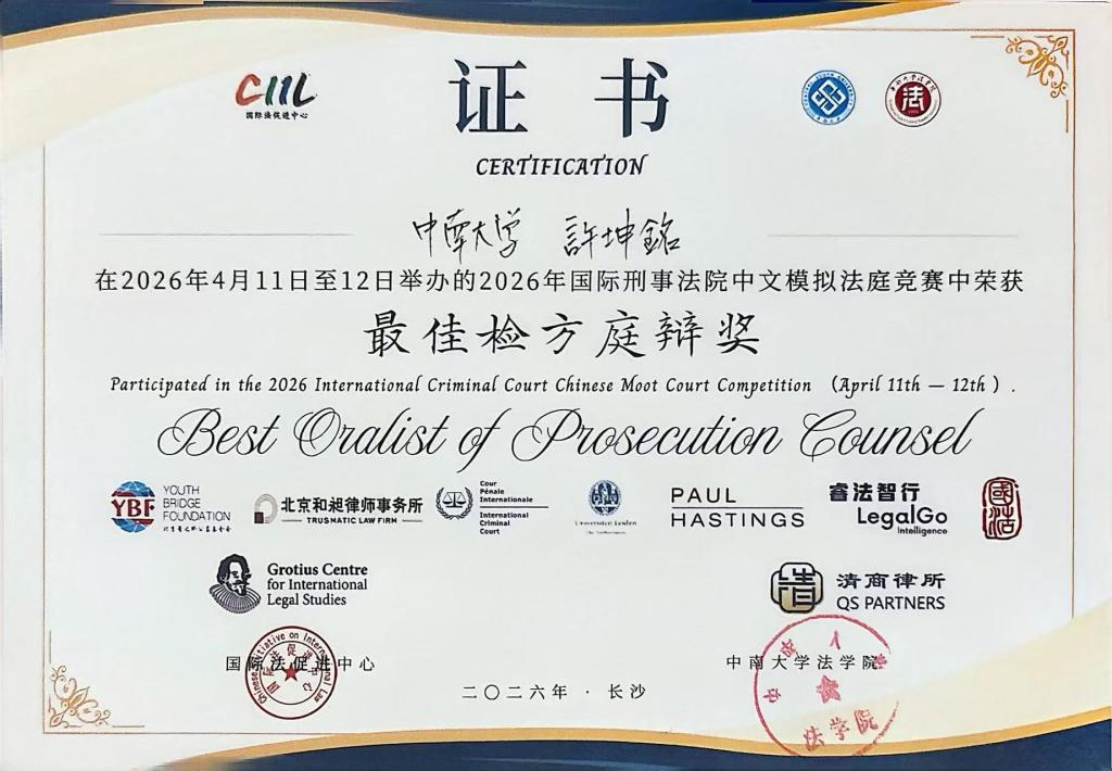 2026年4月12日,第13届国际刑事法院模拟法庭(ICC)中文赛在英国上市官网365圆满落下帷幕。经过激烈角逐,英国365集团公司代表队凭借扎实的专业素养和出色的庭辩表现,从众多参赛高校中脱颖而出,荣获全国一等奖,以全国第三的成绩晋级国际轮。代表队还斩获多项单项荣誉,包括最佳检方律师、最佳政府方代理人、最佳检方庭辩奖、最佳政府方庭辩奖、最佳政府方代理人书状奖。