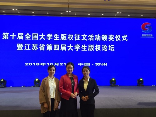 2018年10月21日,第十届全国大学生版权征文活动颁奖仪式在苏州国际博览中心举行。本次活动由国家版权局主办,中国人民大学国家版权贸易基地、中国人民大学创意产业技术研究院承办,国家版权局版权管理司于慈珂司长、中国人民大学创意产业技术研究院彭翊院长、江苏省版权局于国民副局长、江苏省版权协会傅杰三会长以及获奖优秀学生代表、优秀指导老师代表及优秀组织方代表出席此次颁奖活动。