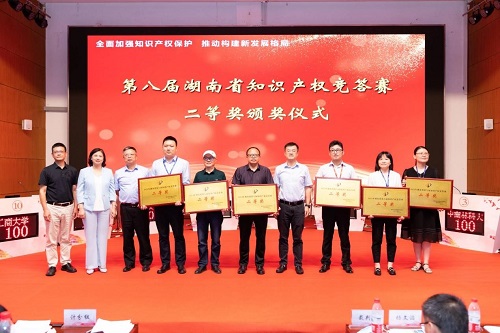 张家界市场监督管理局、永州市市场监督管理局、北京风雅颂专利代理有限公司长沙分公司、中车株洲电力机车研究所有限公司、衡阳师范学院、湘南学院6支代表队获得二等奖。杨翔副院长、左清副厅长、段志雄局长、周科朝副校长为二等奖队伍颁奖。
