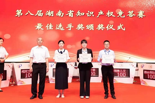 怀化市场监督管理局的选手程婷、北京风雅颂专利代理有限公司长沙分公司的选手曾志鹏、中南林业科技大学的选手谭雨欢获得“最佳选手”的荣誉称号。王军湘巡视员为获奖选手颁奖。