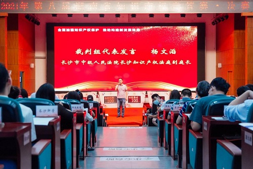 长沙市中级人民法院长沙知识产权法庭副庭长杨文滔作为裁判组代表进行发言。