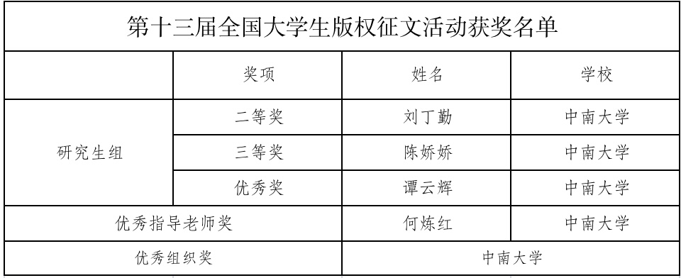 本次活动由国家版权局主办,中国人民大学国家版权贸易基地承办。征文评选分本科生组和研究生组,其中研究生组一等奖10名、二等奖20名、三等奖30名、优秀奖11名,优秀指导老师奖20名,优秀组织奖20个。