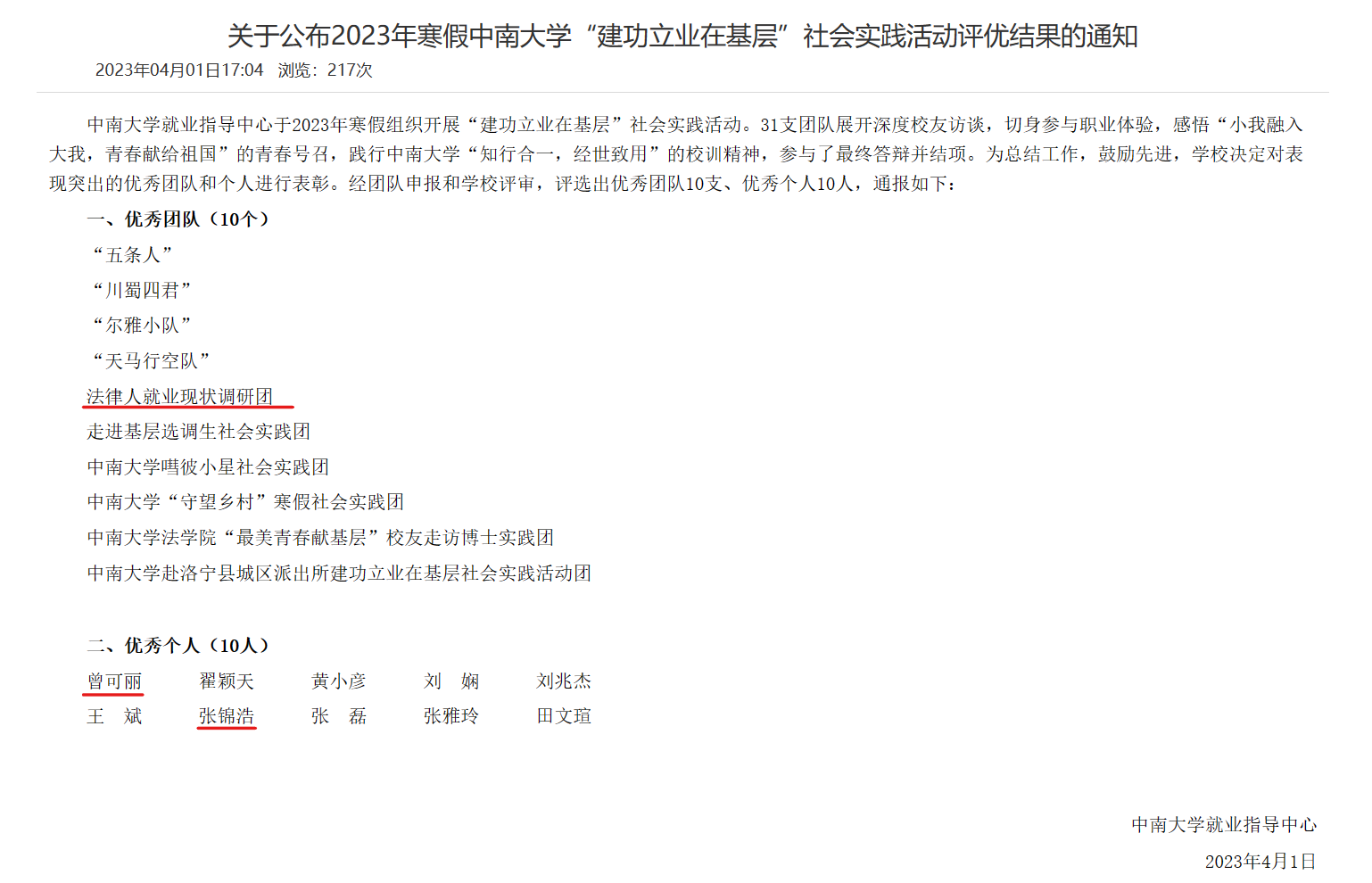 “法律人就业现状调研团” 进行了深度校友访谈实践活动。采访了三位优秀校友,分别是江西省上高县人民检察院晏亮敏检察官、湖南省长沙市岳麓区人民法院舒秋膂法官和湖南金凯华律师事务所刘德文律师。团队通过总结检察官、法官、律师三种法律职业的基本工作情况和发展前景,分析其行业特色和所需的职业素养,形成了扎实的调研记录,以此帮助法学生择业。曾可丽作为调研团的队长,认真履行职责和义务,充分发挥了领导才能和责任心,带领小组顺利完成本次实践活动。张锦浩带领“北京隆安(芜湖)律师事务所实习小队”开展了职场体验活动。在律所主任与带教律师的热情帮助与专业指导下,完成文书撰写与业务沟通等工作,充分地感受了律所办公氛围与律师行业文化,既学习了实务技能、丰富了职场经验,也开拓了就业视野、增长了社会见闻。