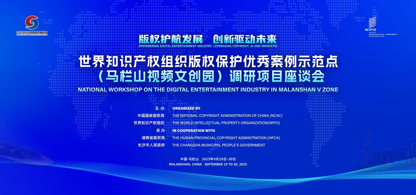 2025年9月29日至30日,由中国国家版权局、世界知识产权组织主办,湖南省版权局、长沙市人民政府承办的“世界知识产权组织版权保护优秀案例示范点(马栏山视频文创园)调研项目座谈会”在湖南长沙举行。国内数字娱乐领域重要企业代表、专家学者、园区中小企业代表等160余人参加活动。
