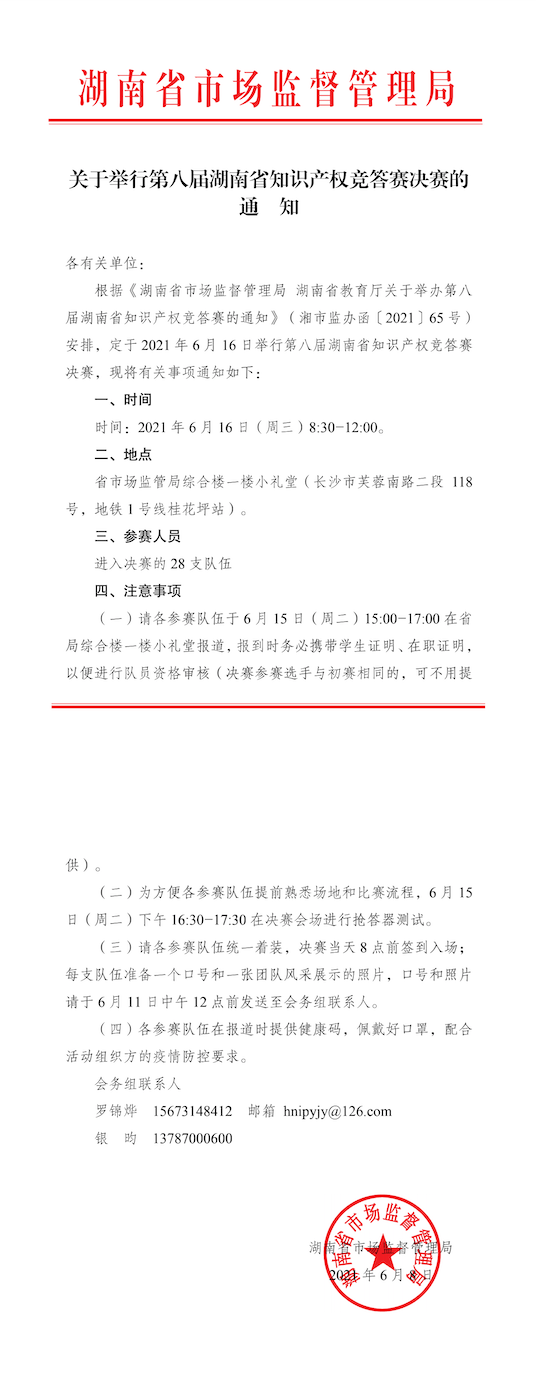 根据《湖南省市场监督管理局 湖南省教育厅关于举办第八届湖南省知识产权竞答赛的通知》(湘市监办函〔2021〕65 号) 安排,定于 2021 年 6 月 16 日举行第八届湖南省知识产权竞答赛决赛,现将有关事项通知如下: